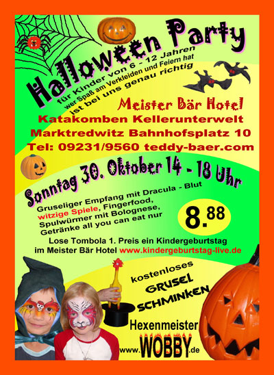 lustige Grusel- & KürbisParty in der Burg Frankenstein, alle kleinen Hexen & Geister erhalten Draculablut & Fingerkartoffeln gratis,